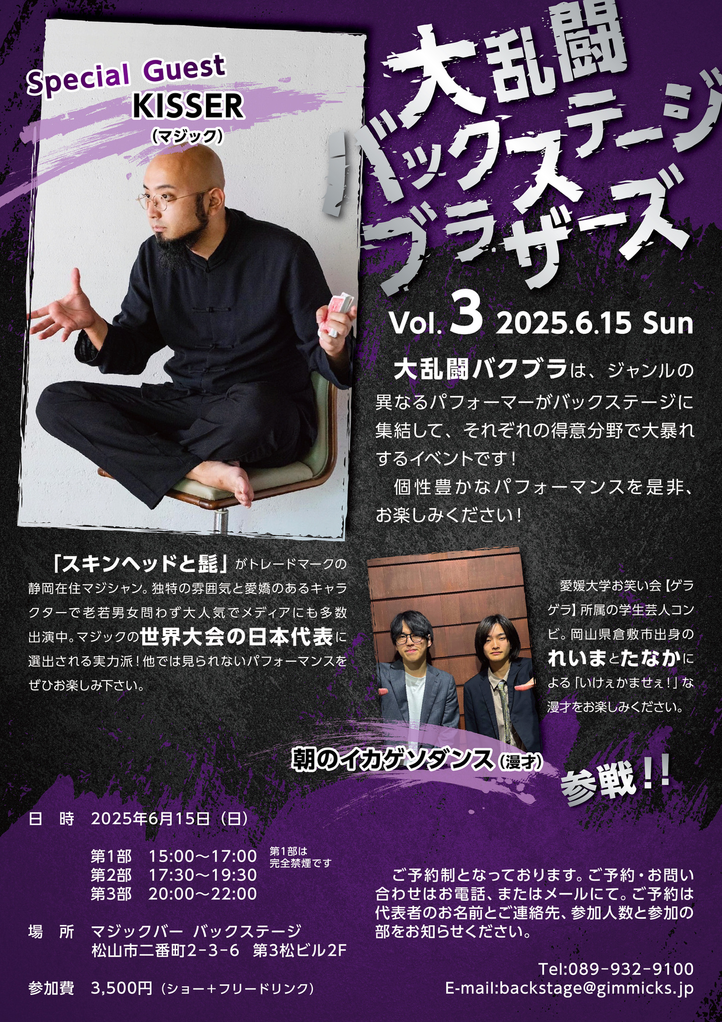 6月15日(日)、大好評の『大乱闘バクブラ Vol.3』を開催します。今回のゲストはKISSER(マジック)と朝のイカゲソダンス(漫才)です。ご予約制となっておりますので、以下のチラシにて内容をご確認のうえご予約ください。ご予約・お問い合わせはお電話(089-932-9100)またはメールフォームにて。ご予約は代表者のお名前とご連絡先、参加人数と希望の部をお知らせください。