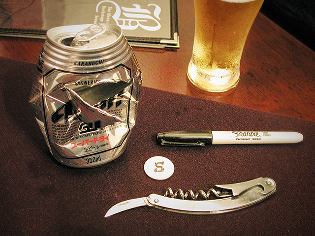 印を付けたコインが新品のビールの缶の中に入ります。コインを取り出すために切り刻んだビールの缶に手をかざすと、徐々にビールの缶が復元されていき、中身の入った新品の状態まで戻ります。