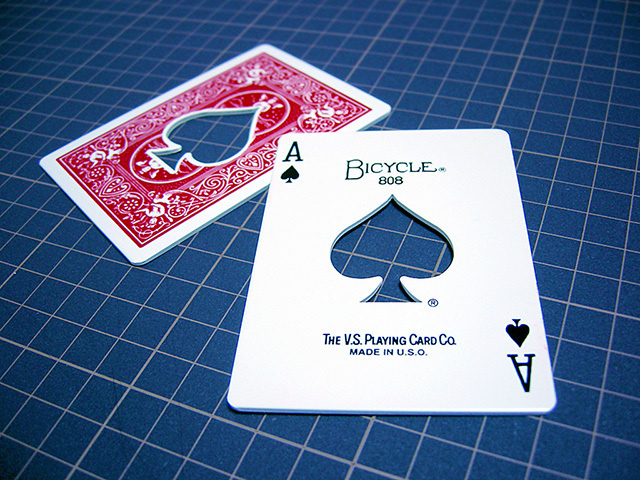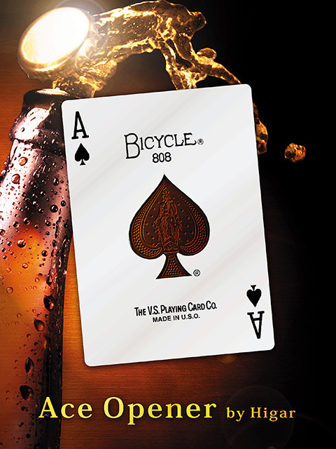 カードを4つのパケットに分け、それぞれのパケットのトップカードを表向きにすると、すべてエースです。さらに4枚のエースをまとめてデックの中に戻すと、エースの形をした栓抜きになって出てきます。