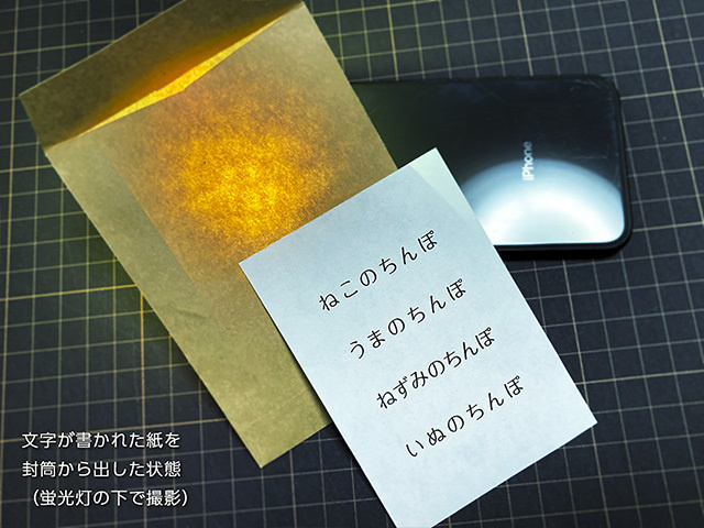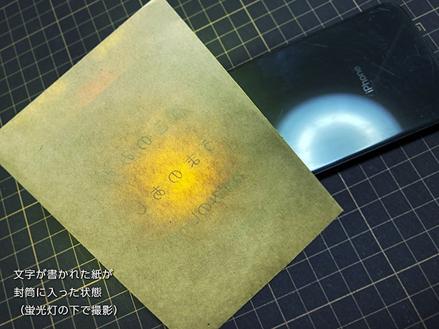 封筒の中に文字が書かれている紙が入っています。スマートフォンのライトを封筒の裏から当て、鏡文字にして観客に読んでもらいます。