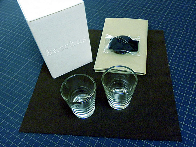 商品はギミック、ホルダー(服装によっては使いません)ショットグラス2個、紙袋、クロス、解説書です。