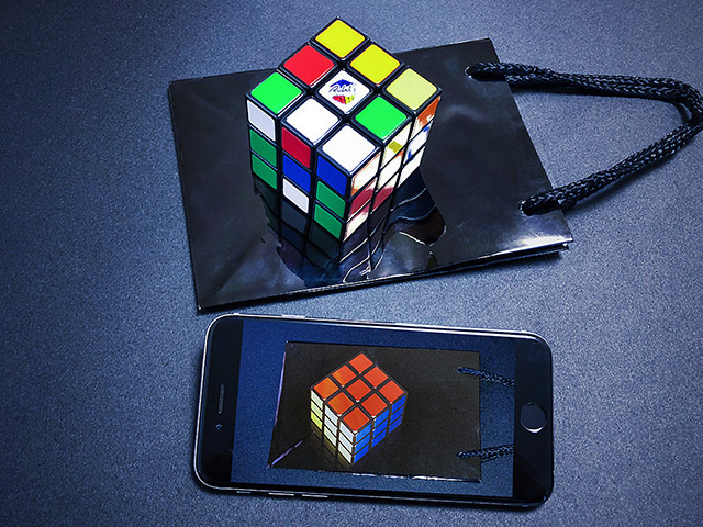 観客にルービックキューブを混ぜてもらい、それを観客のスマートフォンで撮影すると、その写真の中のルービックキューブを揃えることができます。