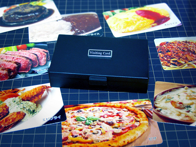 道具:名刺ケースに仕掛けがありますが、見た目は名刺ケースですので観客が仕掛けがあるとは思いません。実際に名刺を入れておくこともできます。メニューのカードの裏は黒のベタ塗りですが、マジシャンからは簡単にカードが識別できます。