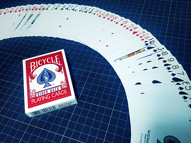 黒いカードと赤いカードを表向きに1枚ずつ置きます。観客にカードを裏向きに見せ、黒いカードか赤いカードか聞き、「黒」と言われたら黒いカードの横に、「赤」と言われたら赤いカードの横に裏向きで置いていき、これをくり返します。裏向きのカードを表向きにすると、すべて観客が指定した色で当たっています。(アウトオブジスワールドを演技の途中でガイドカードを入れ替えることなく演じることができます。)