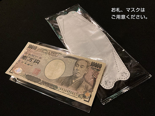 商品はギミック一式、透明の袋です。お札、マスクはご用意ください。解説はオンライン動画です。