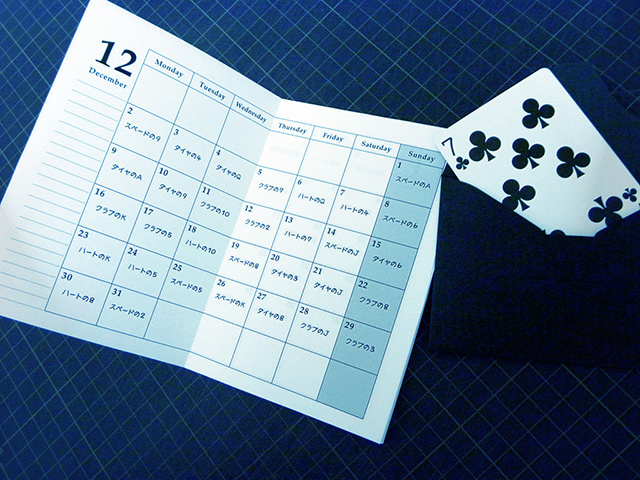 スケジュール帳、封筒、予言のカードはそれぞれ1つずつしか使いません。それ以外にデックやポケットなどは一切使いません。また見開きで1月分のカレンダーを見せられるので、観客は選んだ日を探しやすく、とてもクリーンな印象を与えることができます。