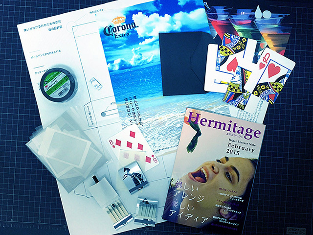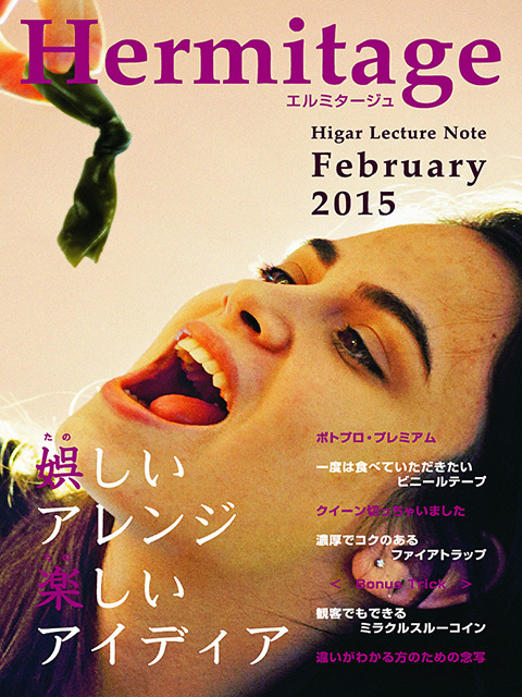 2015年2月15日にヒガーのレクチャーが開催されました。すべてギミック(一部素材)のマジックという異例のレクチャーです。当日使用されたレクチャーノートと専用のギミックがセットになってマジックショップでも販売されることになりました。