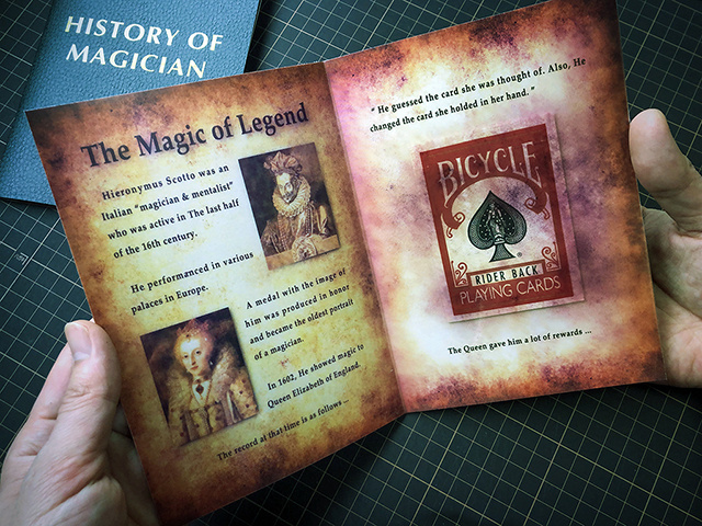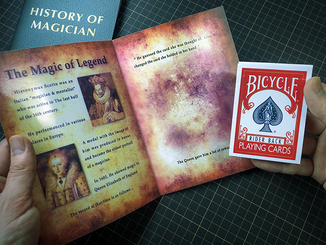 1602年にヒエロニムススコットというマジシャンがエリザベス女王にカードマジックを披露したという文献を見せます。(カードマジック事典にも記載されている史実です。)