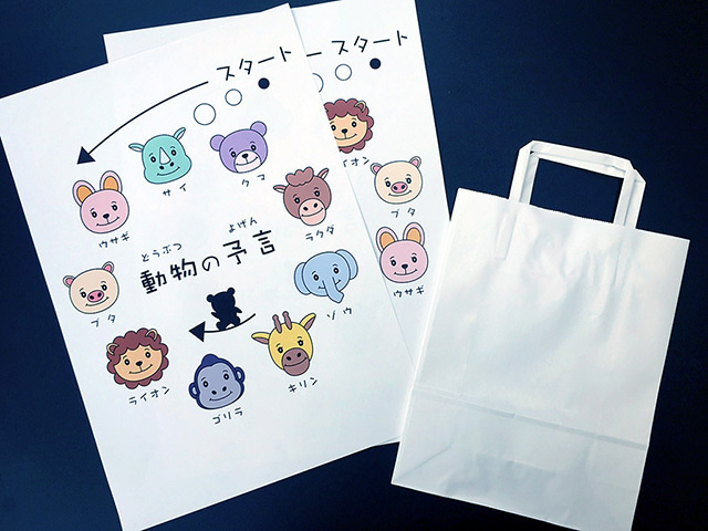 商品はギミックTシャツ、動物の予言(A3サイズ)、紙袋、解説書です。