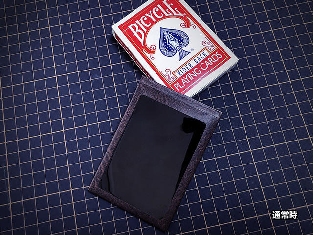 LINE、Messenger、Skype、ZOOMなどのオンライン(ビデオ通話)で観客にカードを1枚選んでもらいます。観客にスマートフォンで何も入っていないパスケースを画面越しにフラッシュ撮影してもらうと、パスケースの中に観客の選んだカードが現れます。