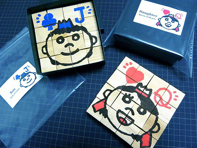 商品は積み木、積み木を入れる箱、解説書です。積み木の柄は、Son(クラブのジャック)、Daughter(ハートのクイーン)か選べます。